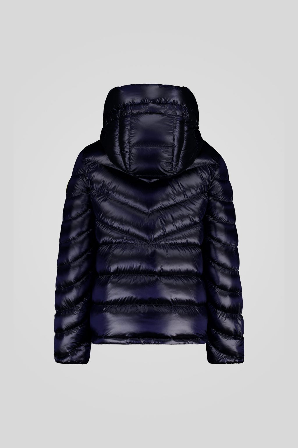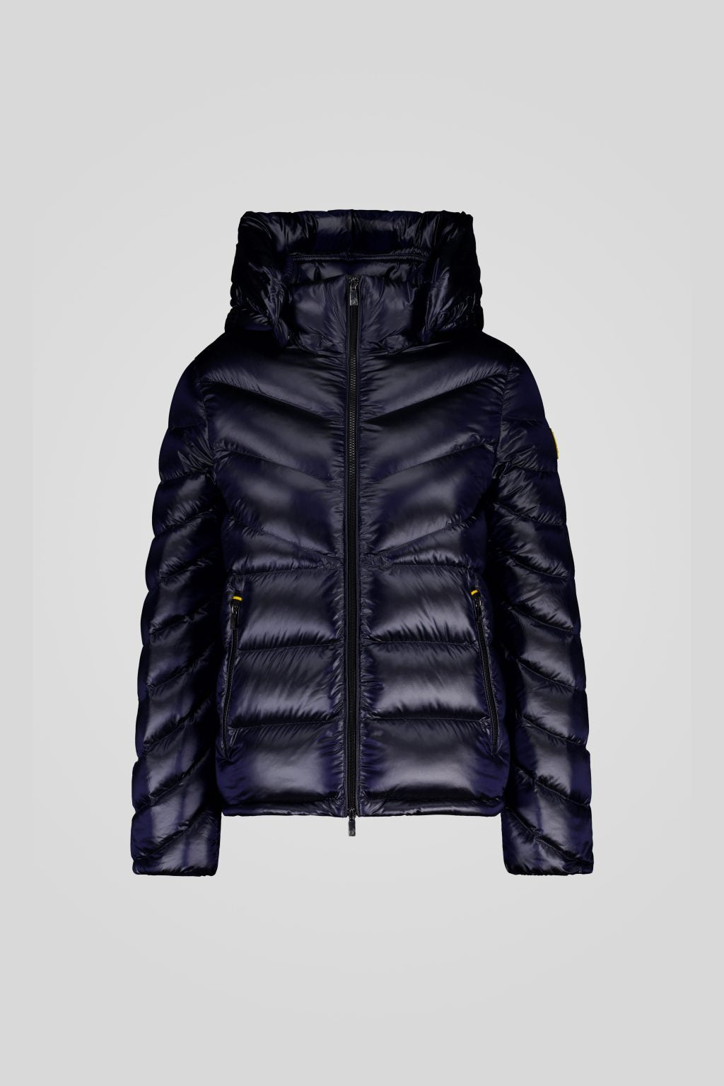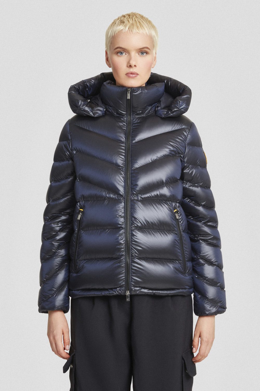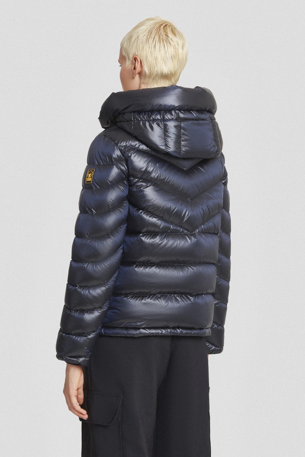 Piumino medio-lungo blu 200 grammi da donna con cappuccio staccabile, realizzato in tessuto microripstop lucido a trama nera e imbottito con vera piuma certificata 800 fill power, che assicura elevate performance termiche e leggerezza assoluta.