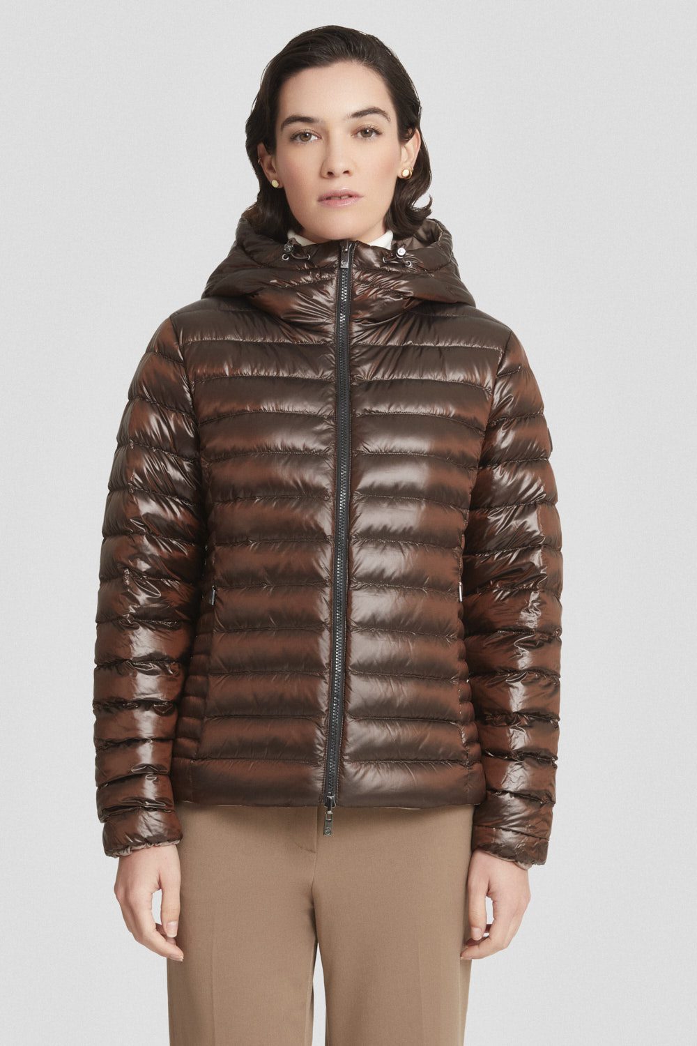 Piumino corto marrone reversibile da donna, che offre due opzioni di utilizzo grazie ai due lati: uno in tessuto taffetas liscio, elegante e raffinato, e l’altro in nylon trapuntato con effetto lucido.