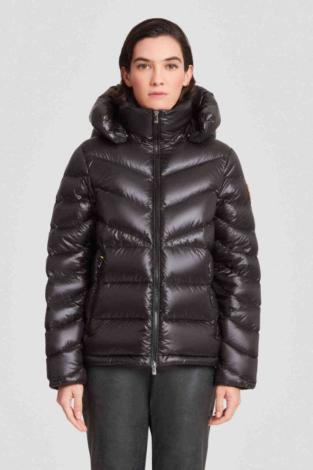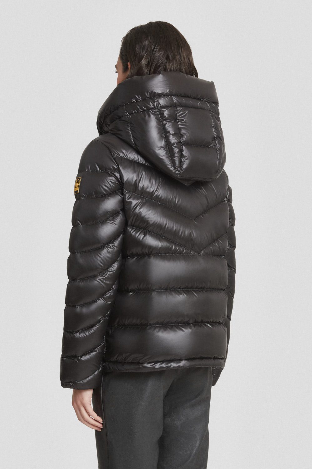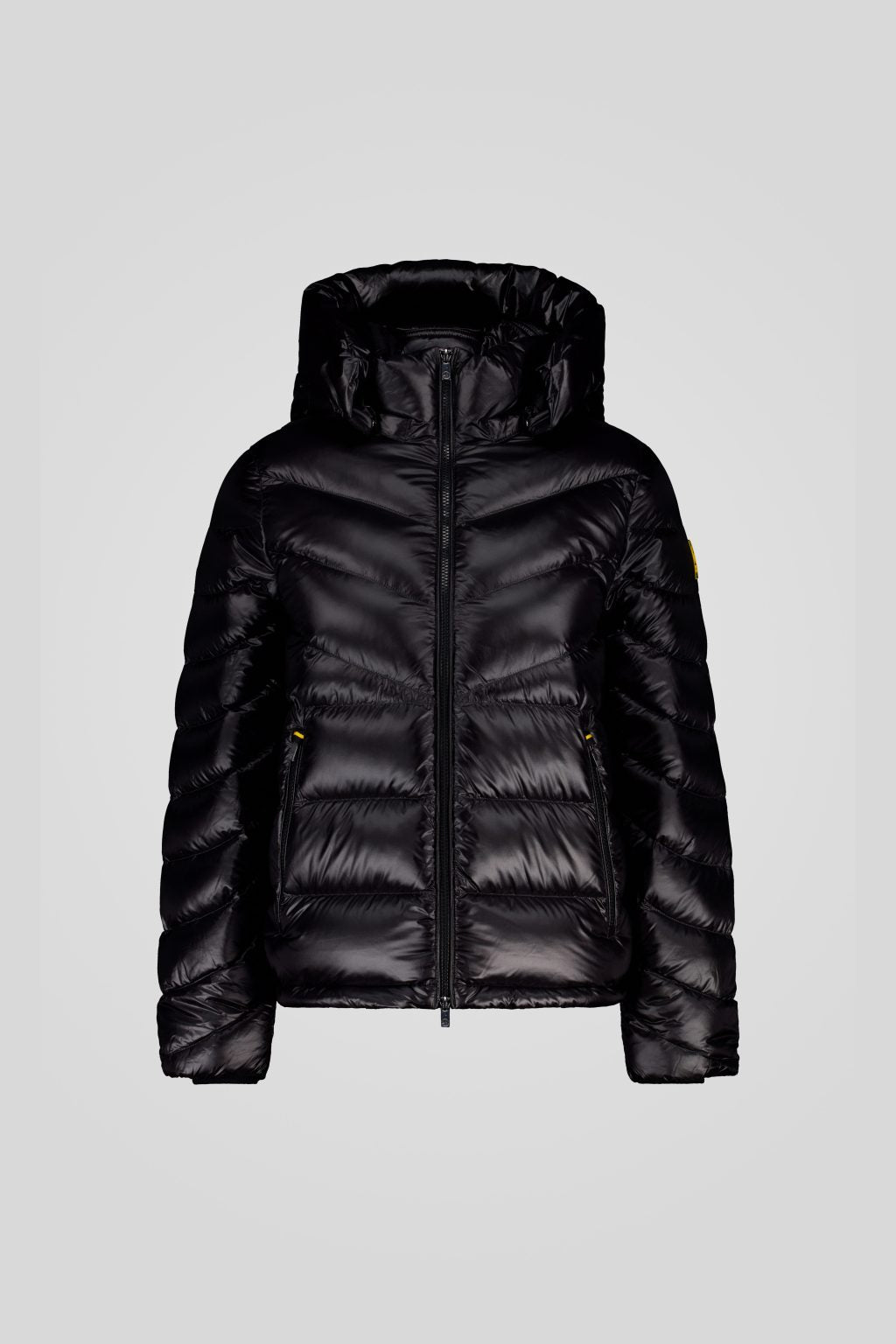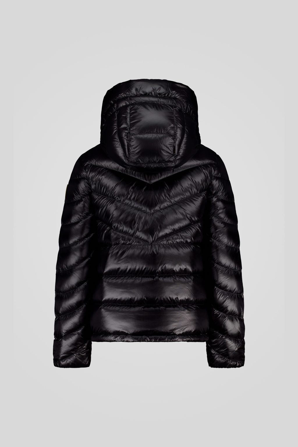 Piumino nero 200 grammi da donna con cappuccio staccabile, realizzato in tessuto microripstop lucido a trama nera.