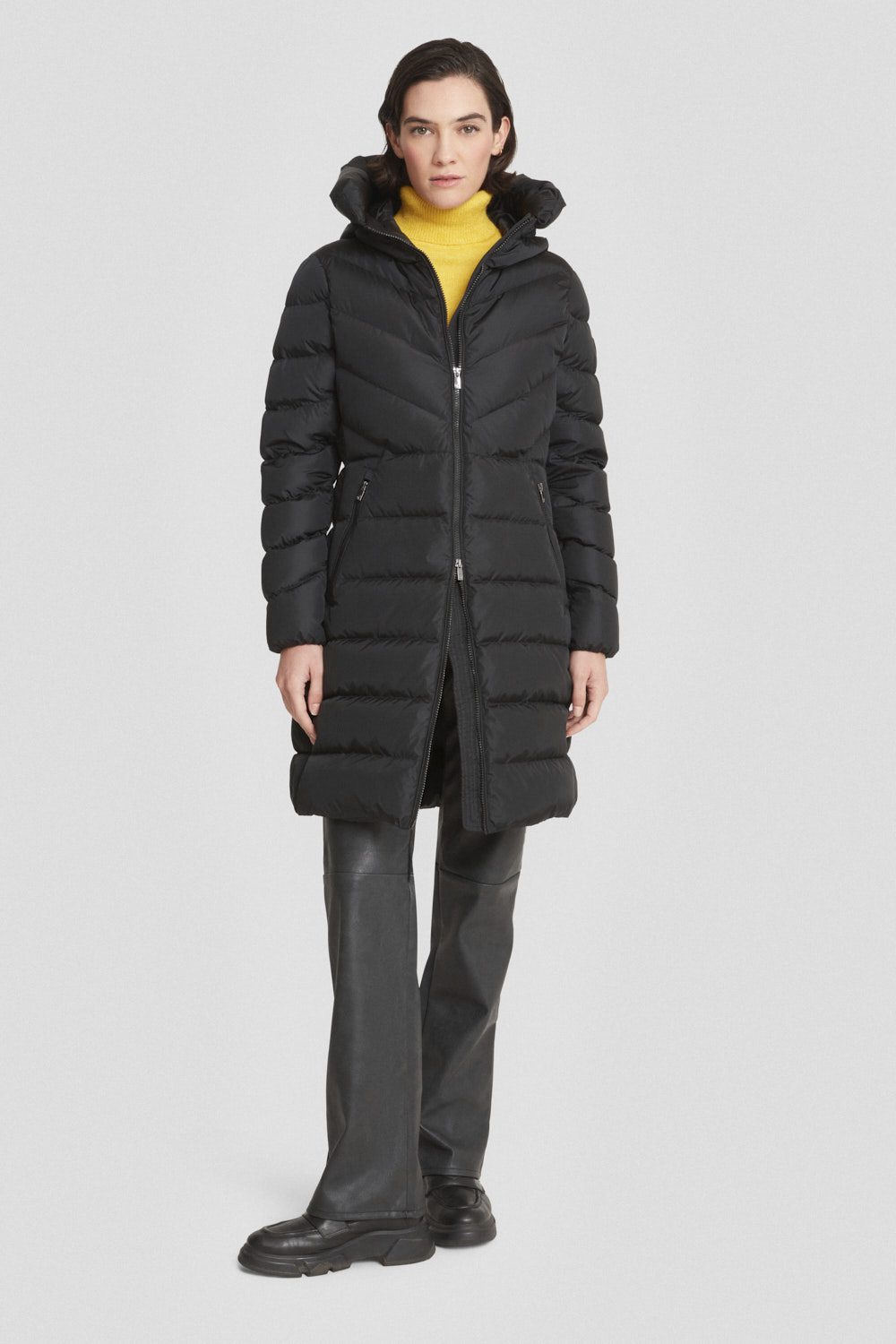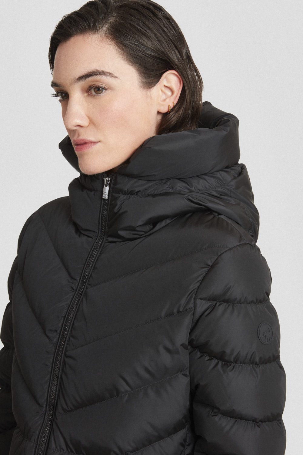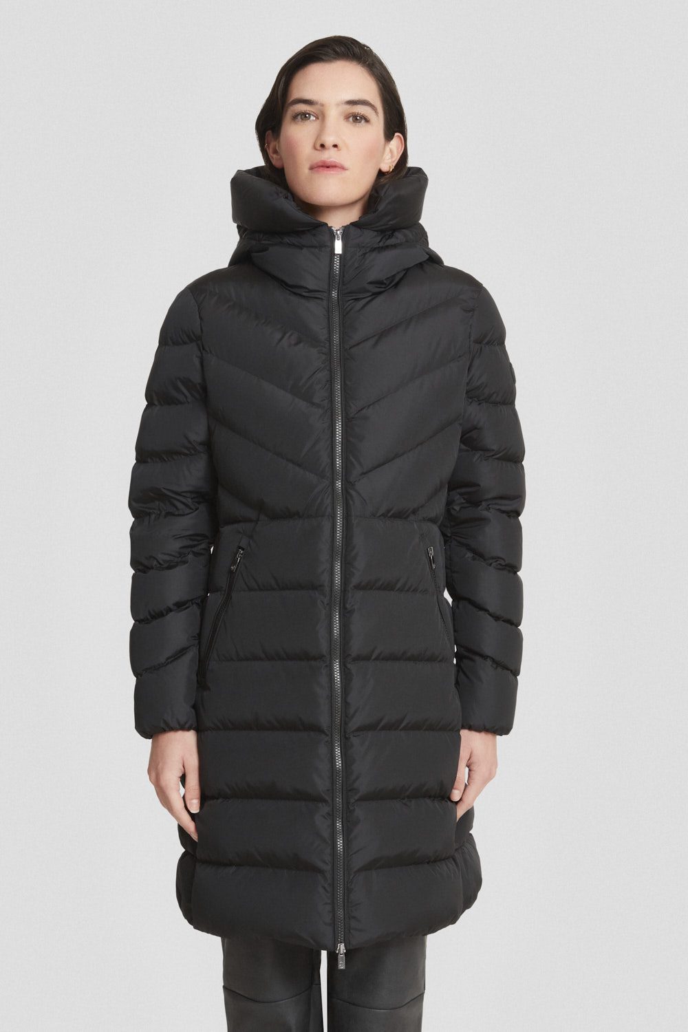 Piumino lungo nero da donna dallo stile versatile e contemporaneo, caratterizzato da un gioco di impunture diagonali nella parte superiore e orizzontali in quella inferiore. Imbottito in vera piuma 800 FP, è realizzato in tessuto plain 100% nylon con trattamento DWR.