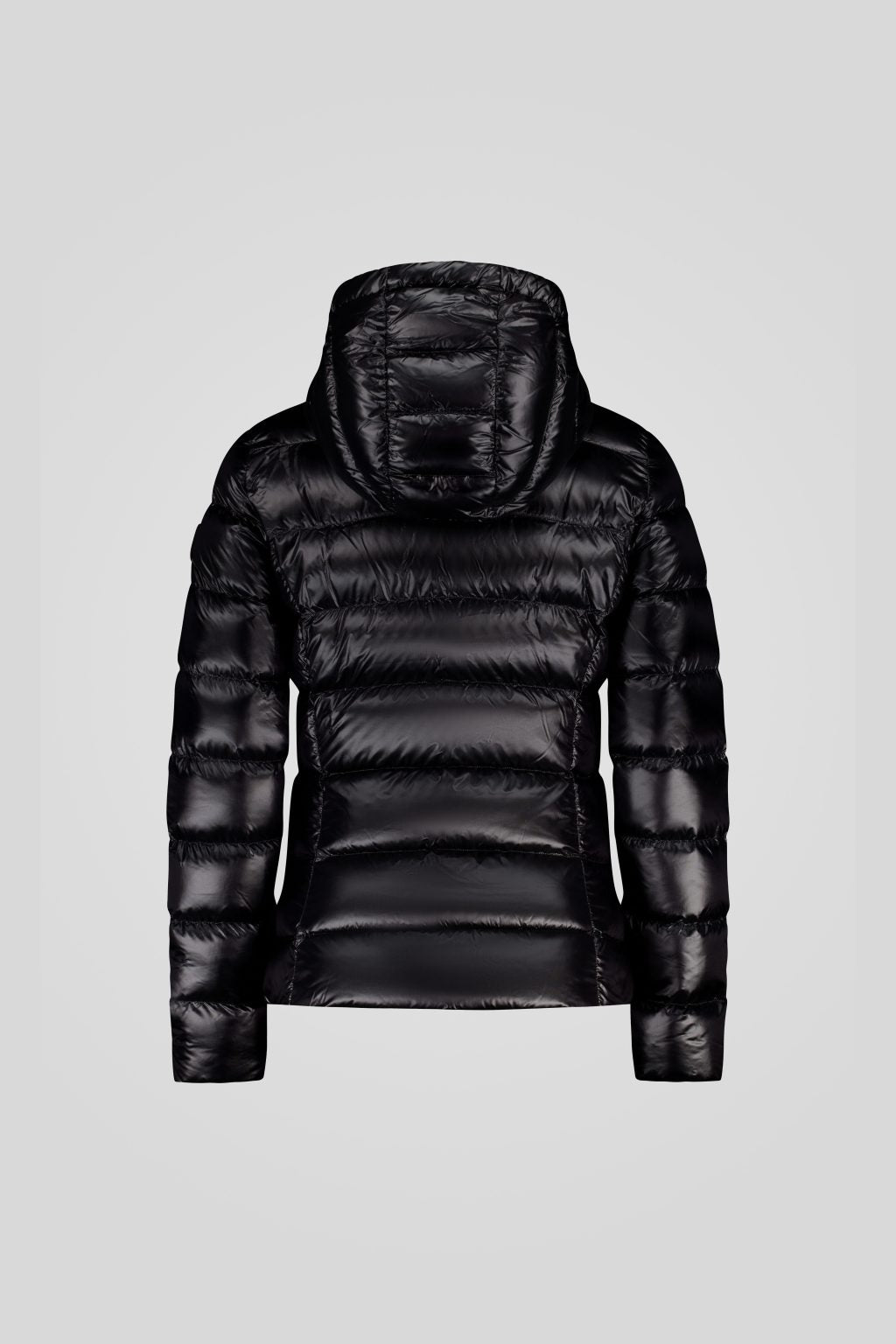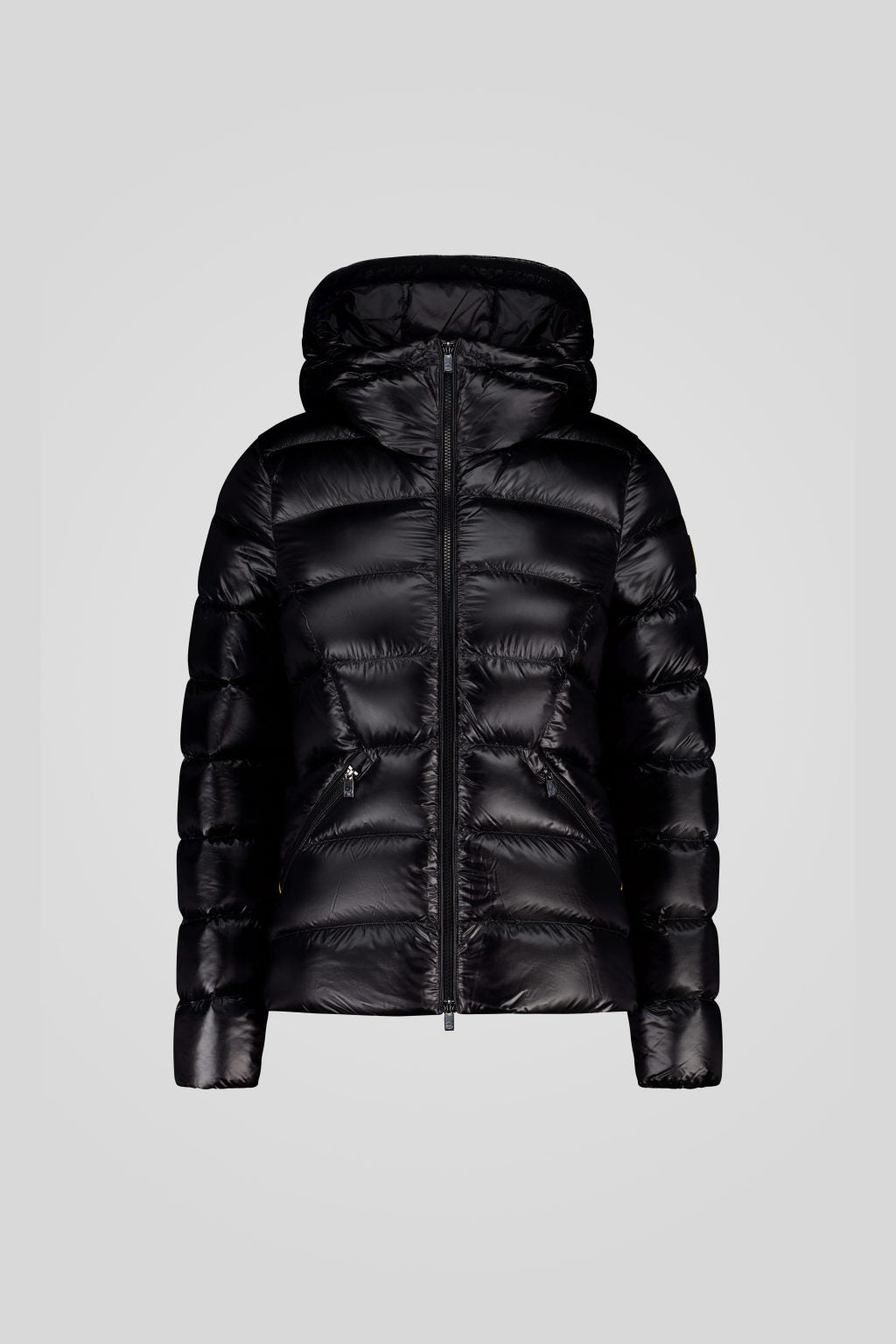 Piumino nero 200 grammi da donna con cappuccio fisso, realizzato in tessuto microripstop lucido a trama nera e imbottito con vera piuma certificata 800 fill power, sinonimo di massima leggerezza e alto isolamento termico.