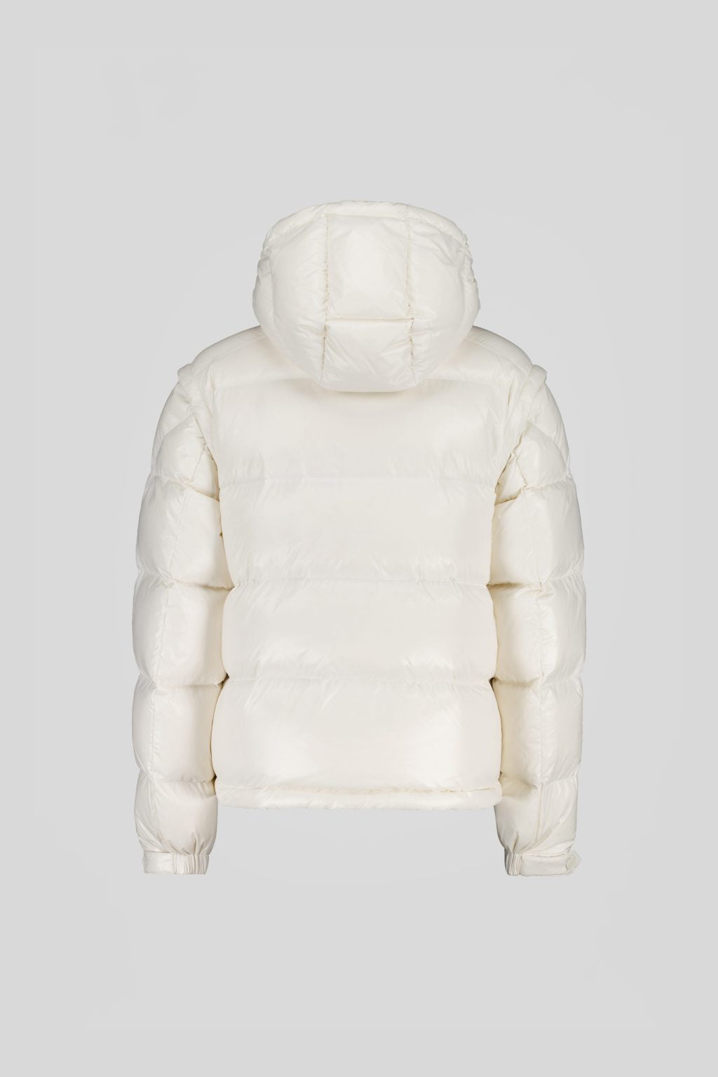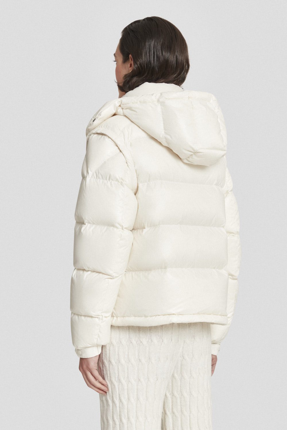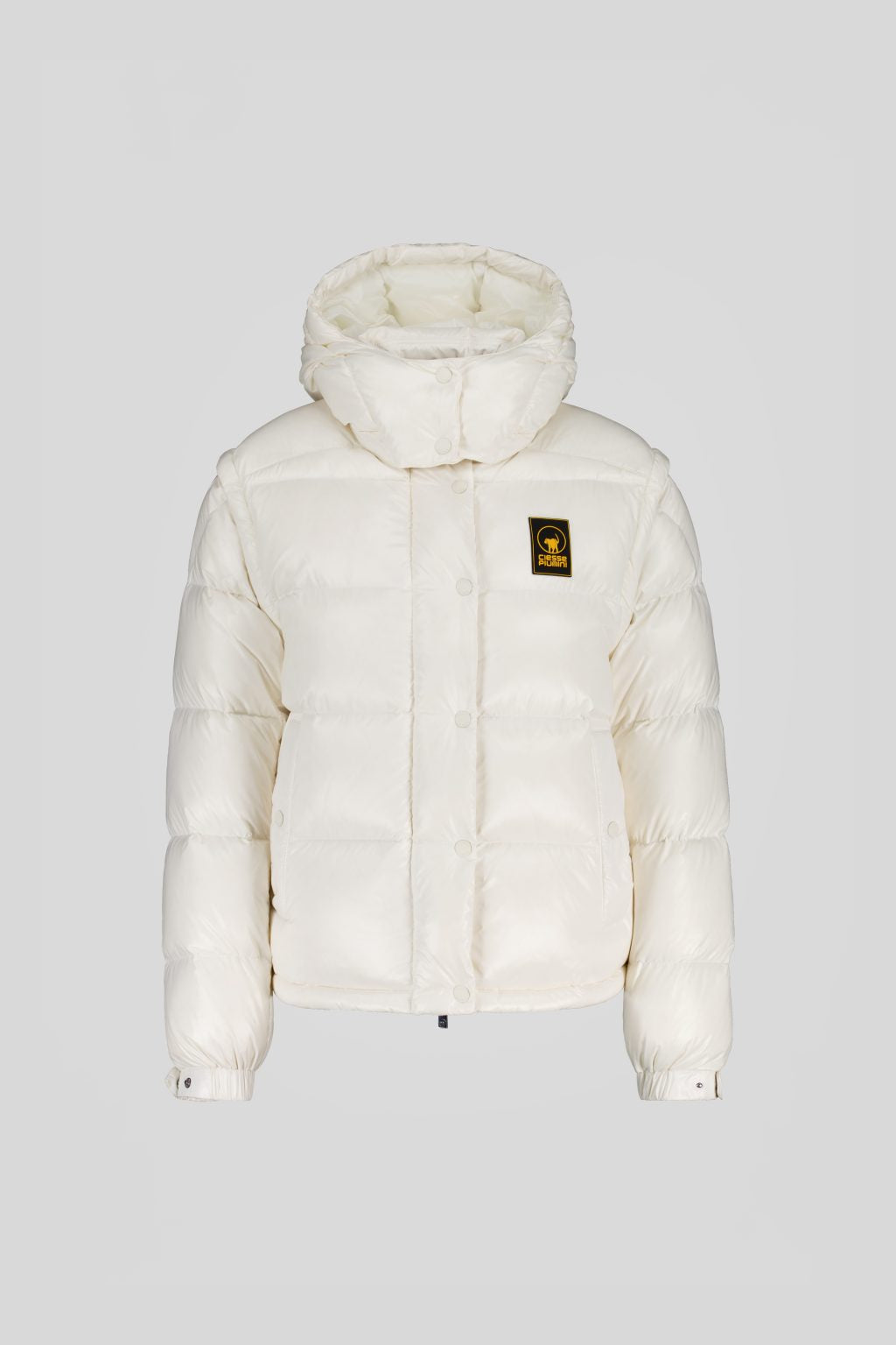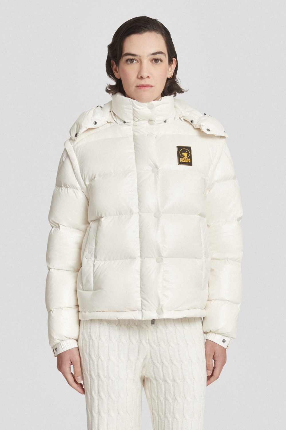 Piumino trapuntato bianco da donna, dallo stile versatile e contemporaneo, imbottito in vera piuma 90/10 e realizzato in tessuto Lacqué 100% nylon, lucido e resistente.